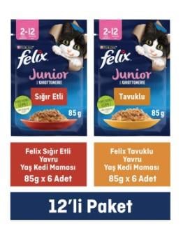 FELIX Karışık Yavru Kedi Yaş Maması 12 x 85 gr (6 Adet Tavuklu ve 6 Adet Sığır Etli) (2508051)