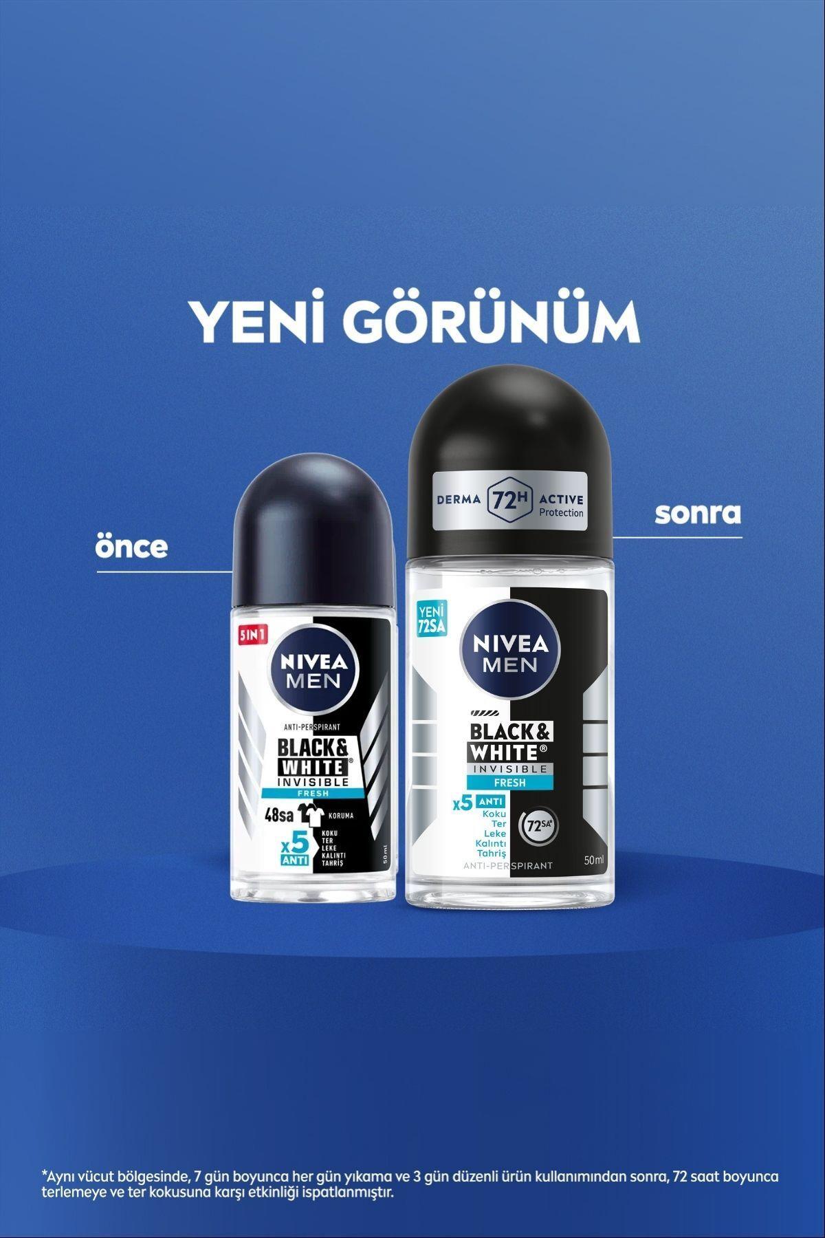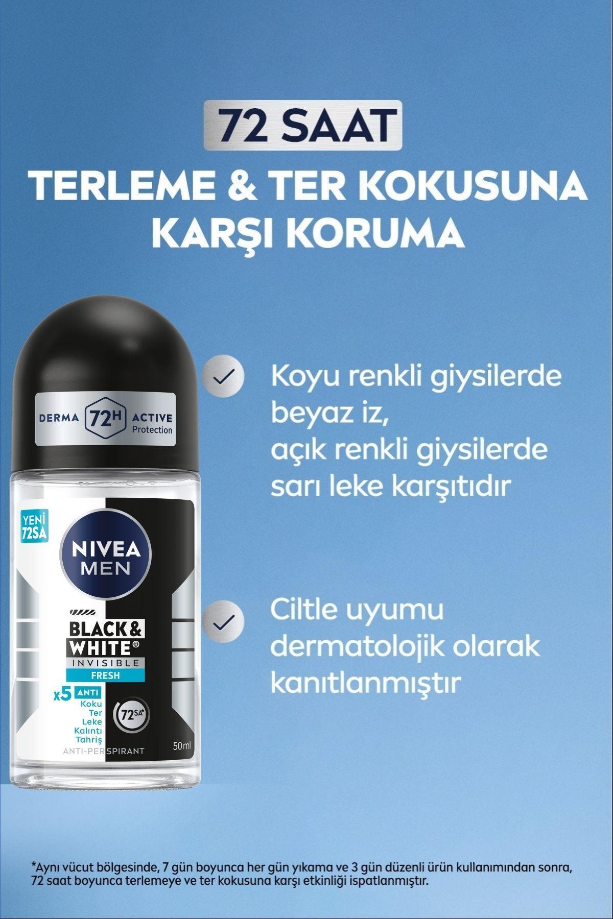 Dünya’nın 1 Numaralı İz Bırakmayan Deodorant Markası* NIVEA’dan!;NIVEA MEN Erkek Roll-on Deodorant Black&White Invisible Fresh, koyu renkli giysilerde beyaz iz, açık renkli giysilerde ise sarı leke karşıtıdır.;72 Saate kadar* etkili Anti-perspirant koruma sağlar.;72 Saat Derma Active Protection teknolojisi sayesinde cildinizi korur.;Cesur ve erkeksi kokuya sahiptir.;X5 Anti Formülü ile koku, ter, leke, kalıntı, tahriş karşıtıdır.;Etil alkol içermez.;Cilt ile uyumu dermatolojik olarak kanıtlanmıştır.;Ürünü temiz ve kuru koltuk altına uyguladıktan sonra tamamen kurumasını bekleyin.;Tüm cilt tipleri için uygundur.; Ciltle uyumu dermatolojik olarak onaylanmıştır.;NIVEA ile Kişisel Vücut Bakım Rutinin!: NIVEA MEN Erkek duş jeli ile yıkandıktan sonra temiz koltuk altı bölgesine NIVEA deodorantını uygulayın.;*Kaynak: Nielsen-IQ, Market Track, Leke karşıtı (anti-stain) deodorantlar, 54 ülke, Adet satış sıralaması, Temmuz 2023 - Haziran 2024;**Aynı vücut bölgesinde, 7 gün boyunca her gün yıkama ve 3 gün düzenli kullanımdan sonra, 72 saat boyunca terleme ve ter kokusuna karşı etkinliği saptanmıştır.