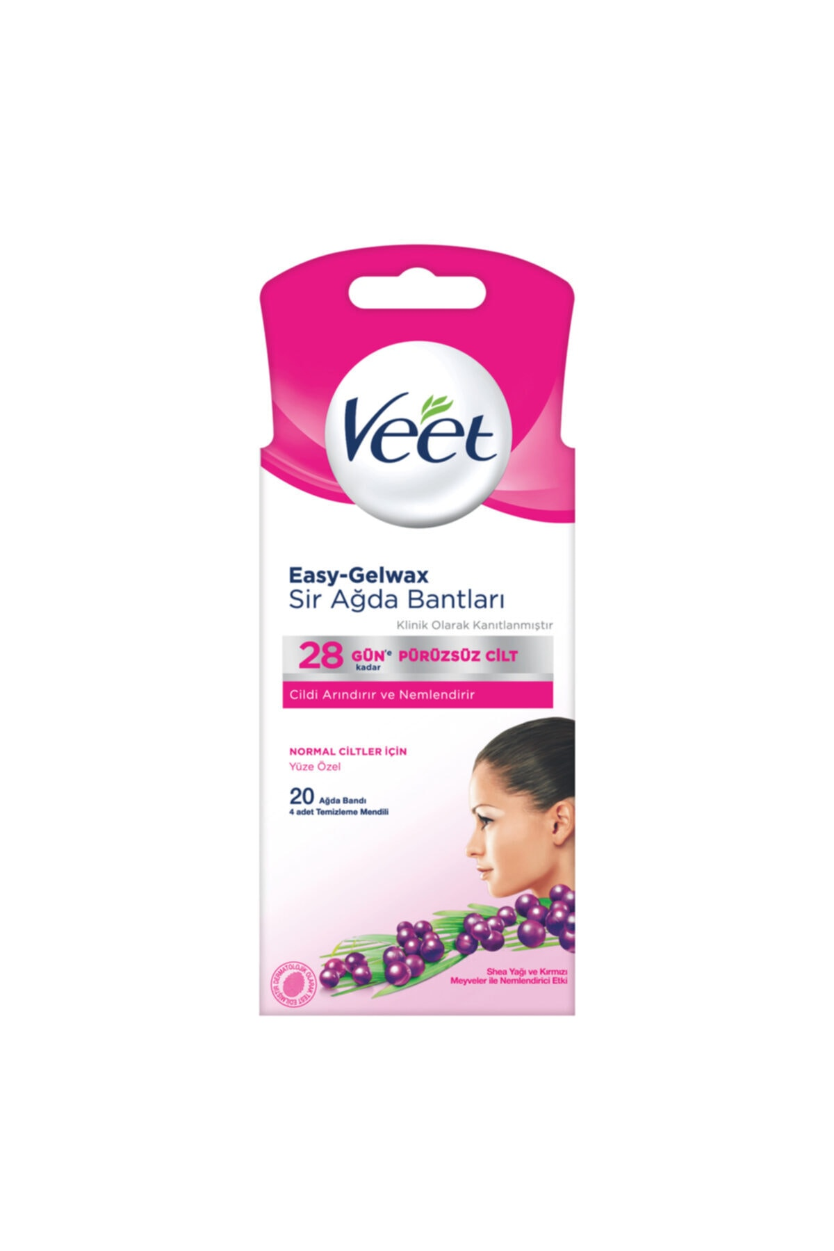 Yüz Bölgesi Normal Ciltler İçin En Kısa Tüylerde Bile Etkili Yeni Easy; Gelwax™ teknolojisi sayesinde bantları ısıtmaya son Formülü Shea Yağı ve Kırmızı Meyveler ile zenginleştirilmiştir ÜRÜN AÇIKLAMASI Yeni Easy; Gelwax™ teknolojisiyle geliştirilmiş jel formülü: • Cilt üzerinde kolayca dağılır ve cildinizi değil, en kısa tüyleri; yakalar,; 1; 5 mm • Tüyleri kökünden alarak 28 güne kadar pürüzsüzlük sağlar; Bu sayede ağda bantlarını daha önce kullanmamış kişilerin bile ilk seferde mükemmel sonuç almasını sağlar; Hoş kokusu ve güzel renkleri ile özel jel dokunun cildinizde bıraktığı hissin tadını çıkarın; Normal ciltler için geliştirilen Veet Sir Ağda Bantlarının içeriğindeki Shea Yağı cildinizi nemlendirir ve Açai Üzümü cildinizde güzel koku bırakır; KULLANIM BİLGİSİ Veet Ağda Bantlarını kullanmadan önce uyarıları dikkatlice okuyunuz; Bantları birbirinden ayırmak için elleriniz arasında ovuşturmanız gerekmemektedir! 4 adımda mükemmel sonuç: 1; Ağda Bantlarını Easy Strip™ kavrama şeritlerinden tutarak dikkatlice birbirinden ayırın; 2; Bandı Easy Strip™ kavrama şeridi yardımıyla cildinize yapıştırın ve bandın iyice yapıştığından emin olmak için tüylerin uzama yönünde ellerinizle bir kaç kez ovuşturun; 3; Bir elinizle cildinizi sıkı tutarak diğer elinizle Easy Strip™ kavrama şeridini kavrayın; Hızlı bir hareketle bandı tüylerin büyüme yönünün aksi yönünde çekin ve bandı cildinize mümkün olduğunca yakın tutun; 4; Ağda yaptıktan sonra, cildinizde kalan ağdayı temizleme mendili ile silin;